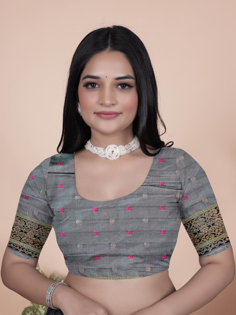 Blouse: Contrasting grey with zari and pink embroidery (unstitched)